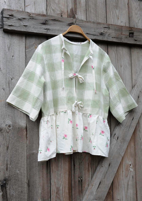 Dit item is gemaakt van een combinatie aan vintage en nieuwe stoffen. Deze stoffen zijn zorgvuldig bij elkaar gezocht en verwerkt tot deze leuke blouse! Handgemaakt en 100% katoen.