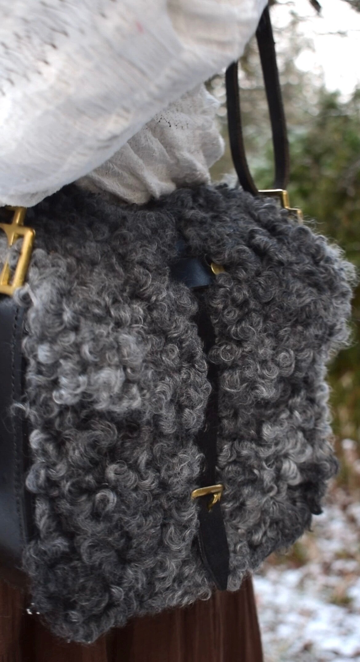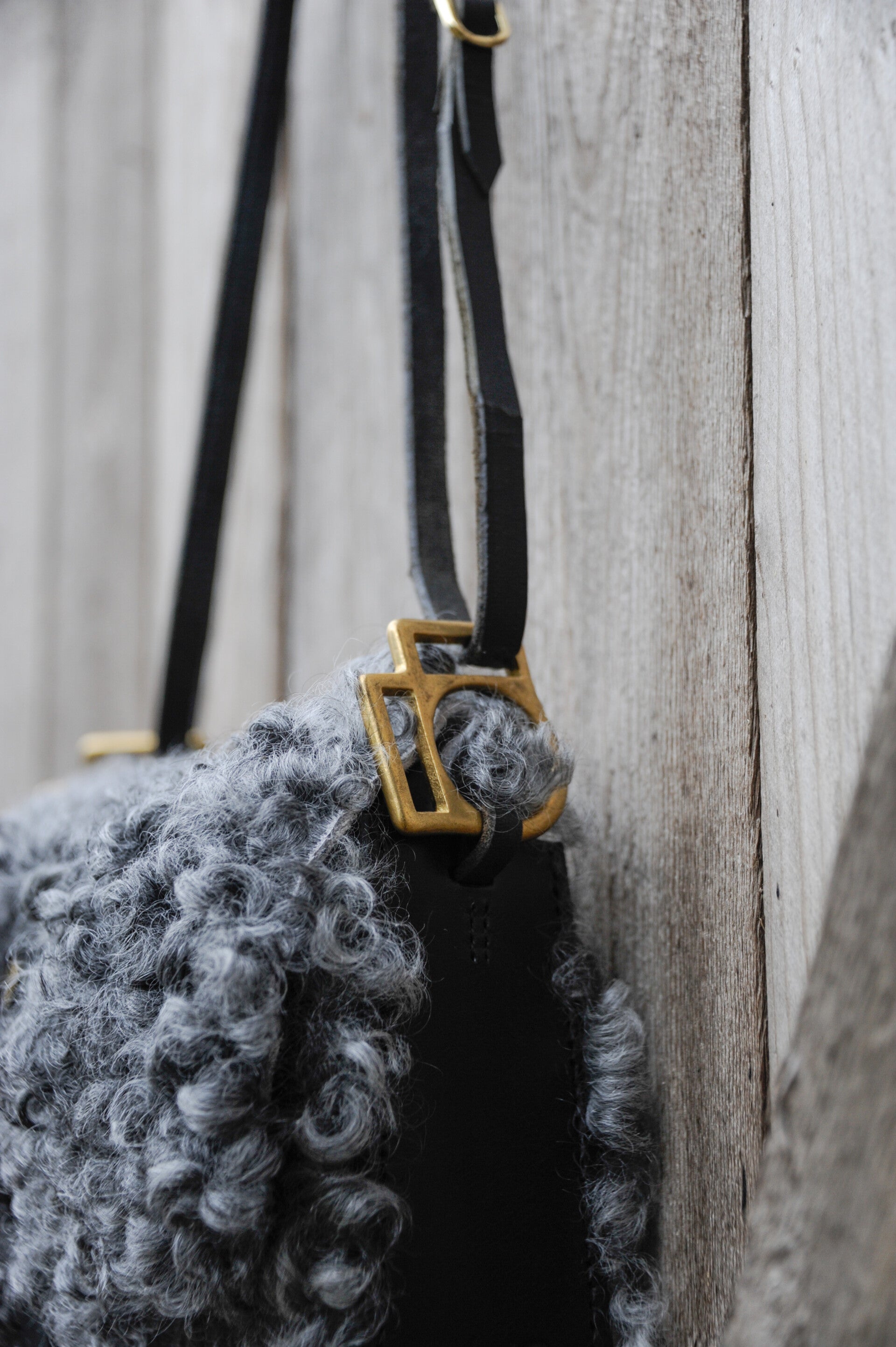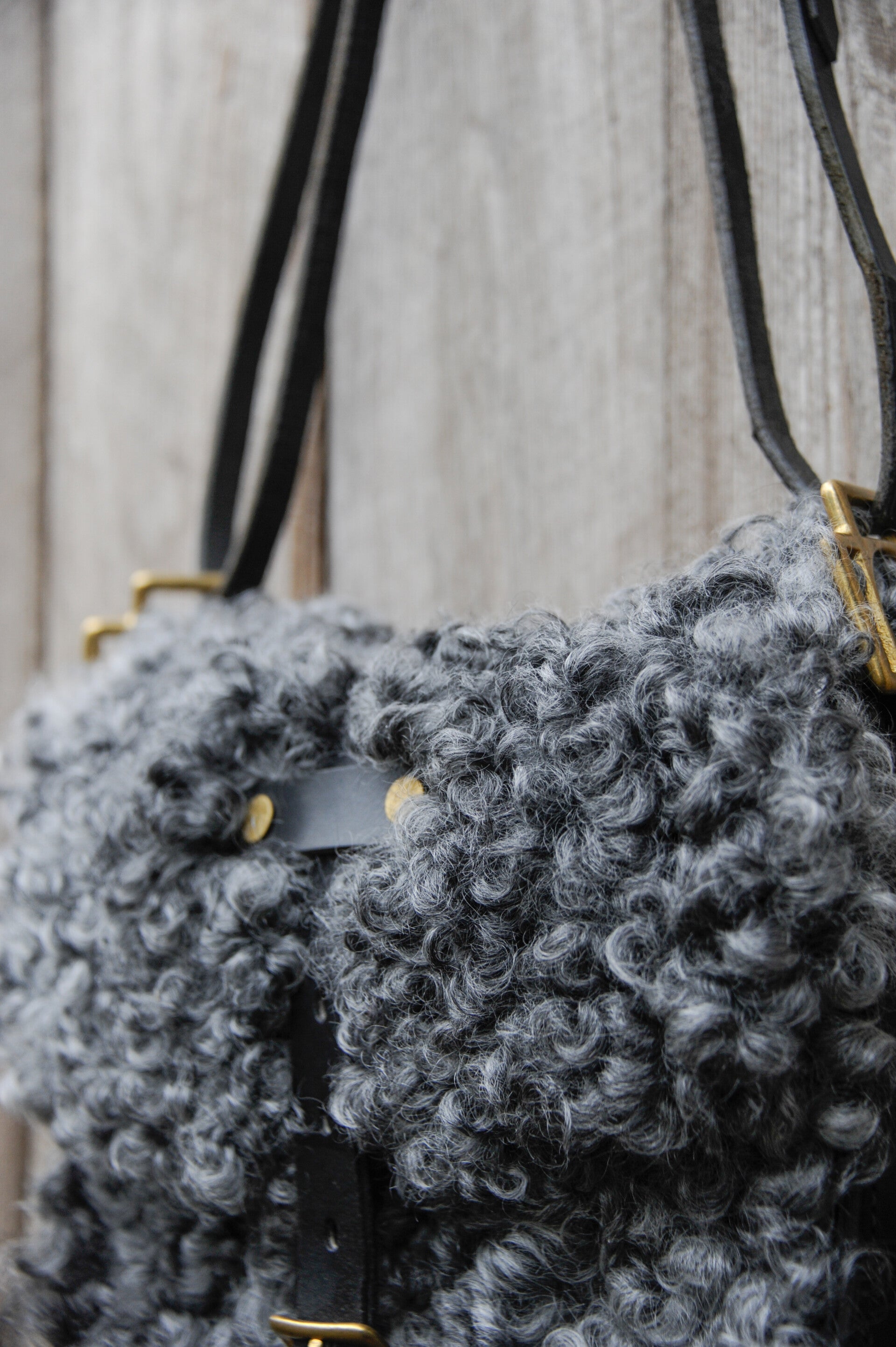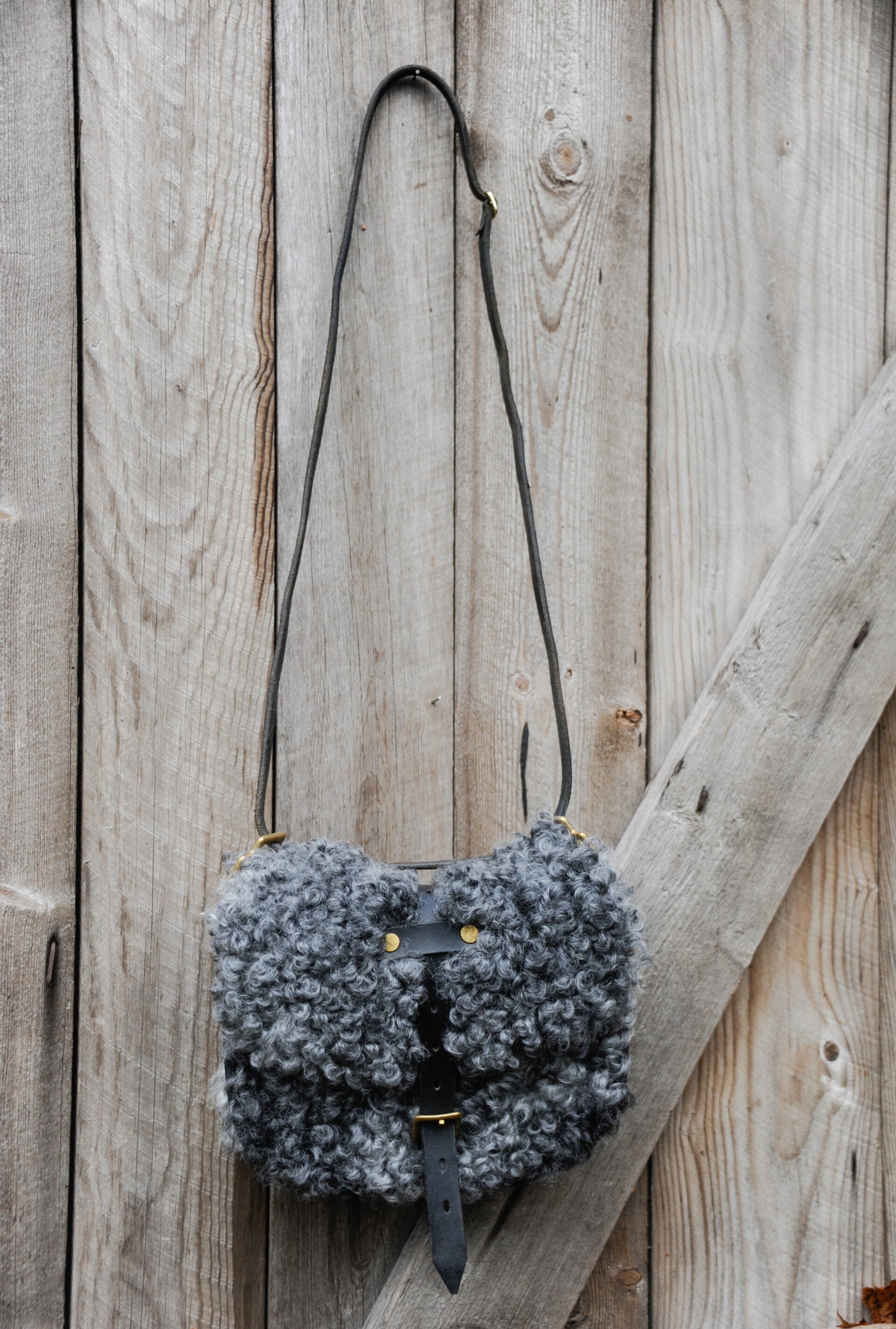 Volledig handgemaakt van hergebruikt, echt zadelleer in combinatie met een lokale schapenvacht. Zwart leer en een grijs/zwart/witte hide. Kan als korte schoudertas worden gedragen maar kan ook langer gedragen worden. Ongeveer 26 X 21 X 6 cm. 65 cm lang voor de schouder. 136 cm lang draagsnoer. Mogelijk om een aantal cm te verstellen.